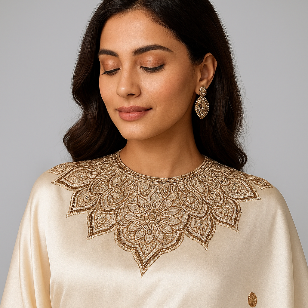 Beautiful kaftan-style drape that blends traditional charm with a modern silhouette.